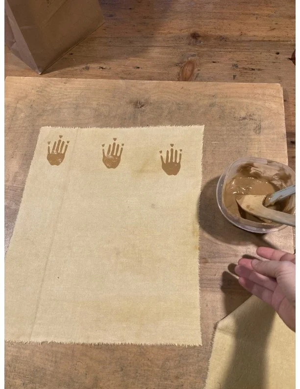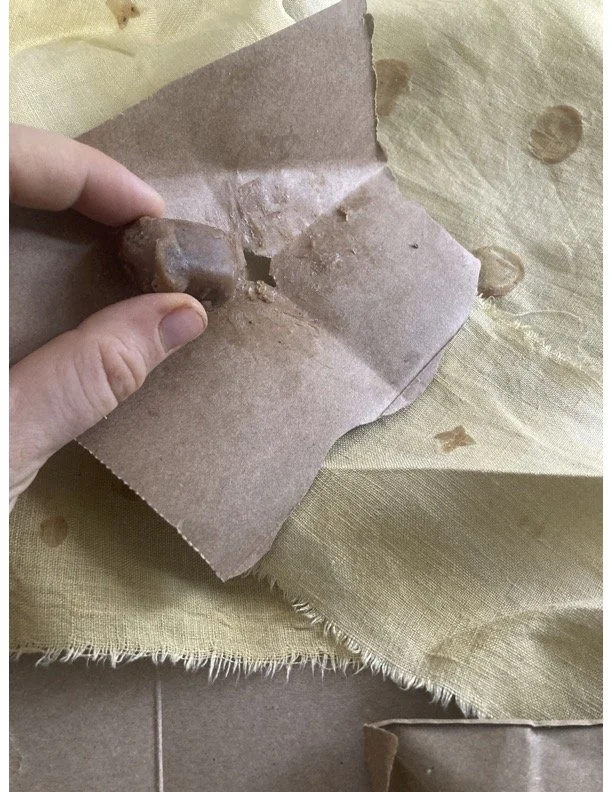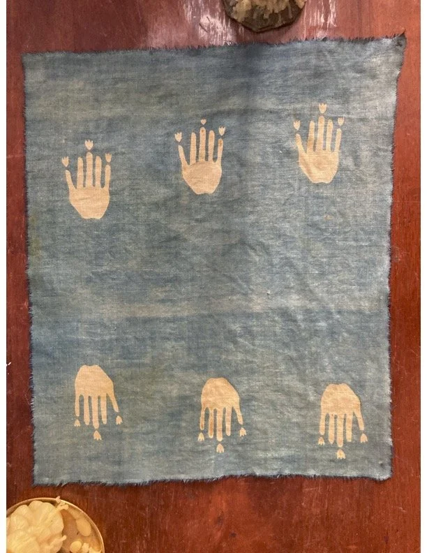 Indigo and Marigold on Linen (Above) The pattern is made from wax resist infused with pine resin and mugwort