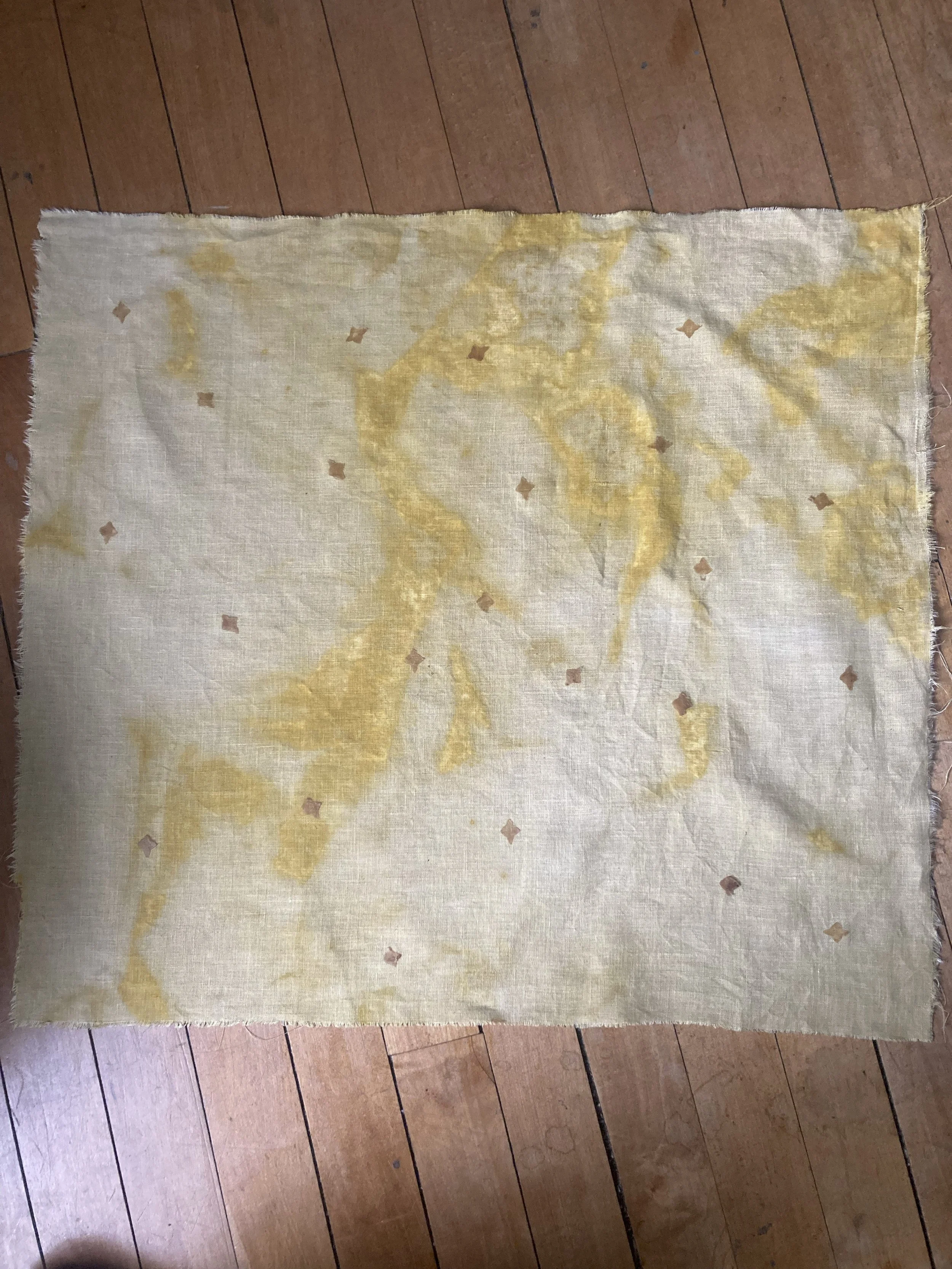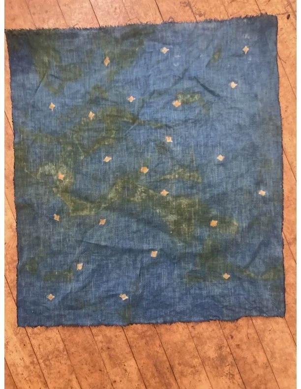 Indigo and Marigold on Linen (left) pattern made using katazome from codo experiment (Thank You!)