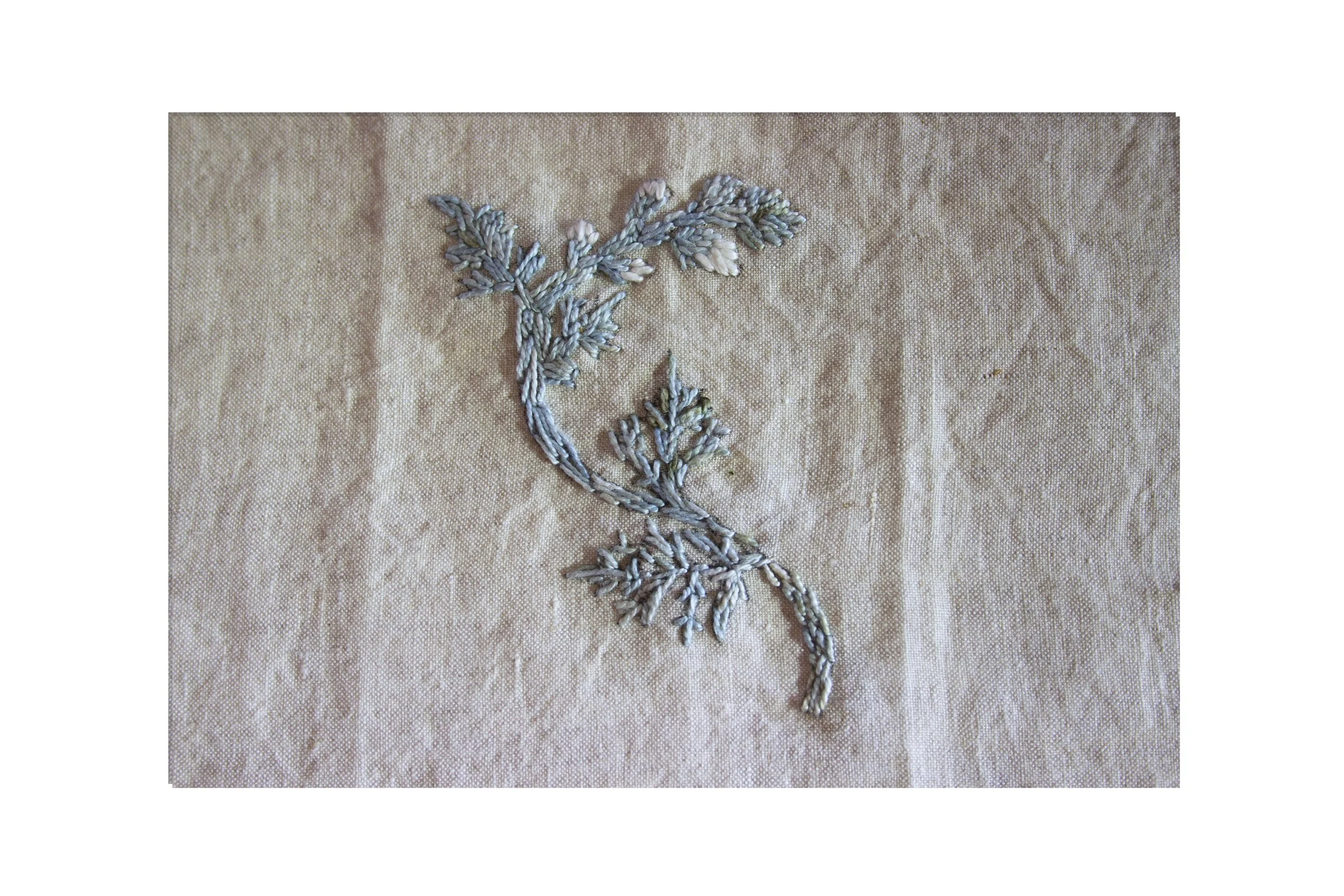 I've been working with, growing and fermenting indigo for the past three years in my home, Greenfield Massachusetts, located in the Connecticut River Valley on the traditional lands of the Nipmuc, Pocumtuc, and Abenaki peoples. I've been heavily inspired by the Deerfield Blue and White needlework society who lived just down the river from me. In the mid 1800s they were one of the first groups in the United States to receive and ferment indigo. They embroidered both the flowers they saw around them and the flowers that they imagined were growing in the land where the indigo came from. Inspired by Deerfield I have been imagining the pasture plants of the future and embroidering them in the Deerfield blue and white style, as well as branching out and making some with rice resist paste and my own wax resist.